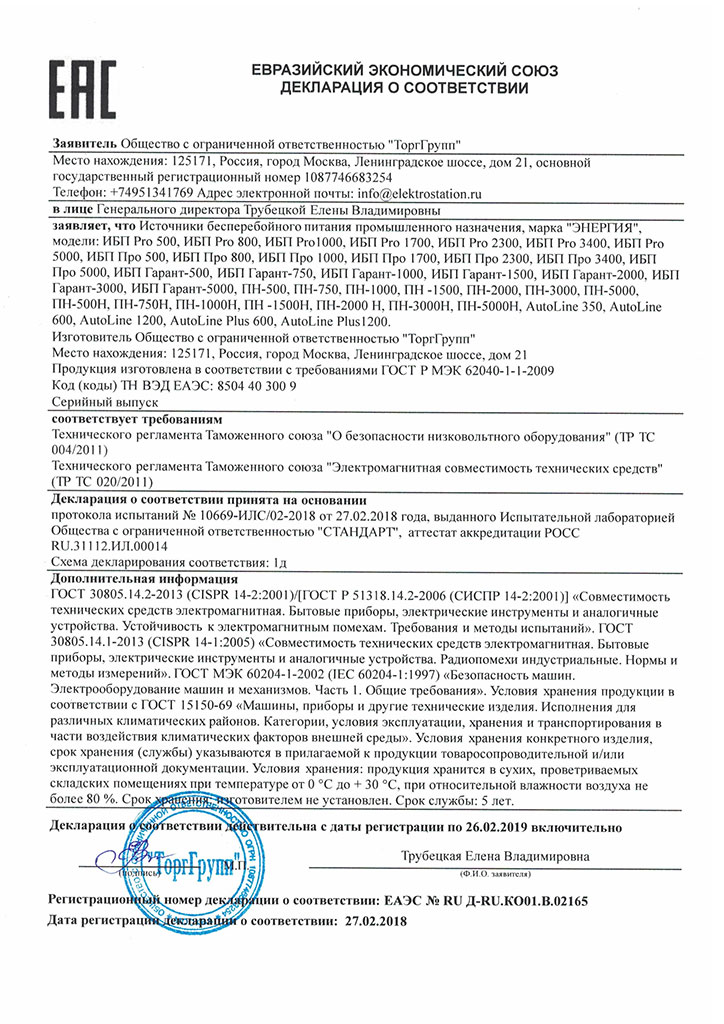 Скачать сертификатЭнергия ИБП Гарант-750 представляет собой источник бесперебойного питания с внешней аккумуляторной батареей (приобретается отдельно) и встроенным стабилизатором, обеспечивающим поддержание нормального напряжения, без перехода на питание от АКБ, даже при значительных скачках и просадках напряжения. В основном, ИБП Гарант-750, применяются для защиты газовых котлов, автоматики въездных ворот, и других маломощных потребителей, для которых важно обеспечить защиту и беспрерывный режим работы в условиях отключения электроэнергии.