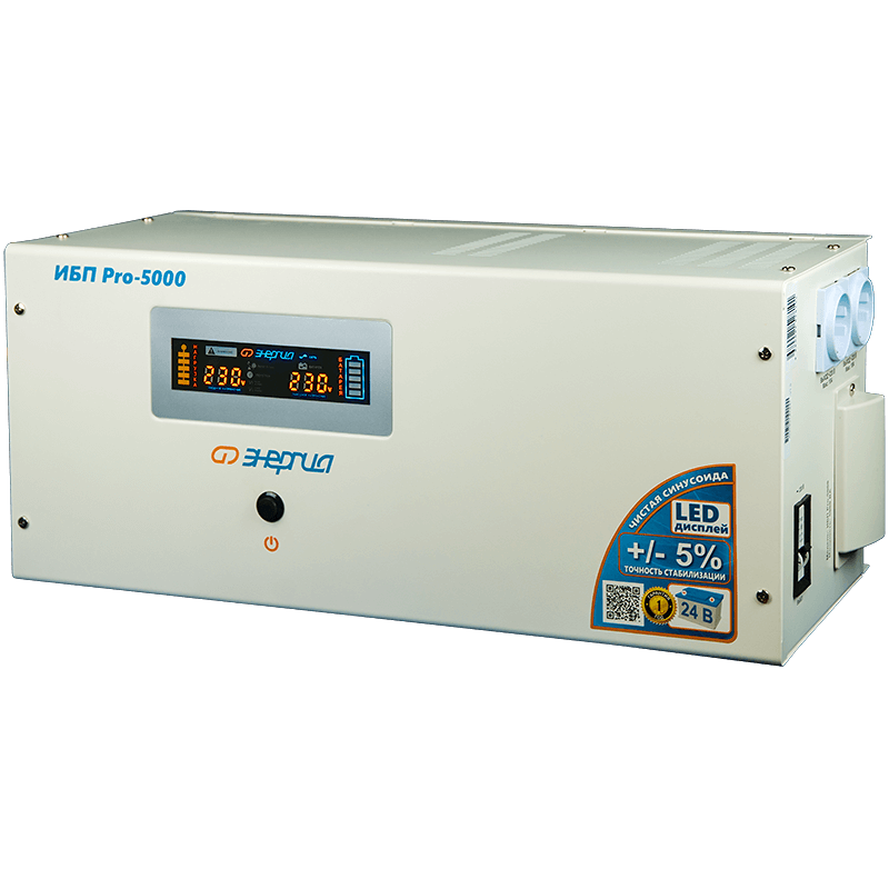 Скачать сертификатЭнергия ИБП Pro 5000 используется в системах бесперебойного питания с внешними аккумуляторами и позволяет подобрать количество и ёмкость АКБ под требуемое время автономной работы. Благодаря цифровому ШИМ-преобразователю, инвертор выдаёт чистую синусоиду, что делает возможным использовать его с такими чувствительными приборами как газовые котлы, медицинское оборудование, и в других случаях, когда обычные ИБП с модифицированной синусоидой использовать нельзя.