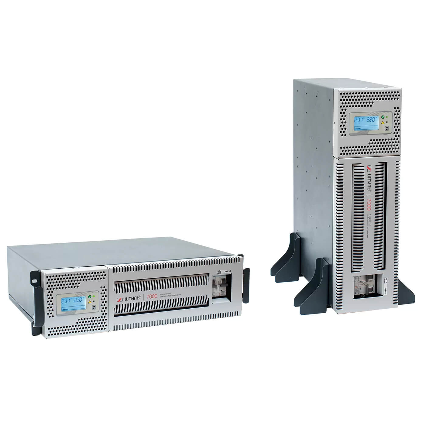 Стабилизаторы Штиль серии RT допускают как вертикальную установку (с помощью специальных упоров), так и горизонтальную, в 19-дюймовые направляющие серверных стоек или шкафов. Все детали для крепления входят в комплект поставки устройства. Стабилизатор оснащен поворотной панелью управления: при смене положения устройства (с вертикального на горизонтальный или наоборот) ее положение тоже можно менять для более удобного использования.