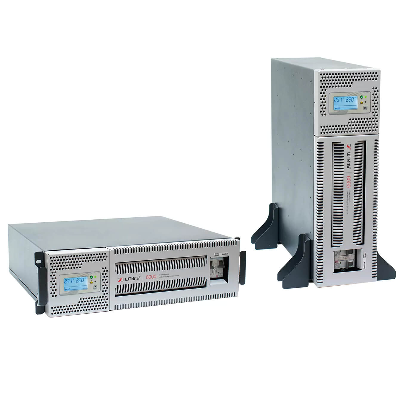 Стабилизаторы Штиль серии RT допускают как вертикальную установку (с помощью специальных упоров), так и горизонтальную, в 19-дюймовые направляющие серверных стоек или шкафов. Все детали для крепления входят в комплект поставки устройства. Стабилизатор оснащен поворотной панелью управления: при смене положения устройства (с вертикального на горизонтальный или наоборот) ее положение тоже можно менять для более удобного использования.
