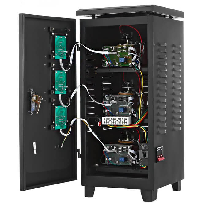 В конструкции стабилизатора Ресанта АСН-15000/3-ЭМ применены современные инновационные подходы, позволившие добиться удачного сочетания высокой надежности прибора, точности удержания выходного напряжения и его невысокой стоимости. В отличии от своих аналогов, стабилизатор оснащен многоступенчатой системой защиты, включающей в себя блоки защиты от коротких замыканий, перегрузки, обрыва фазы, пониженного и повышенного напряжения, фильтрами сетевых помех, а так же термозащитой, обеспечивающей абсолютную пожарозащищенность электросети.