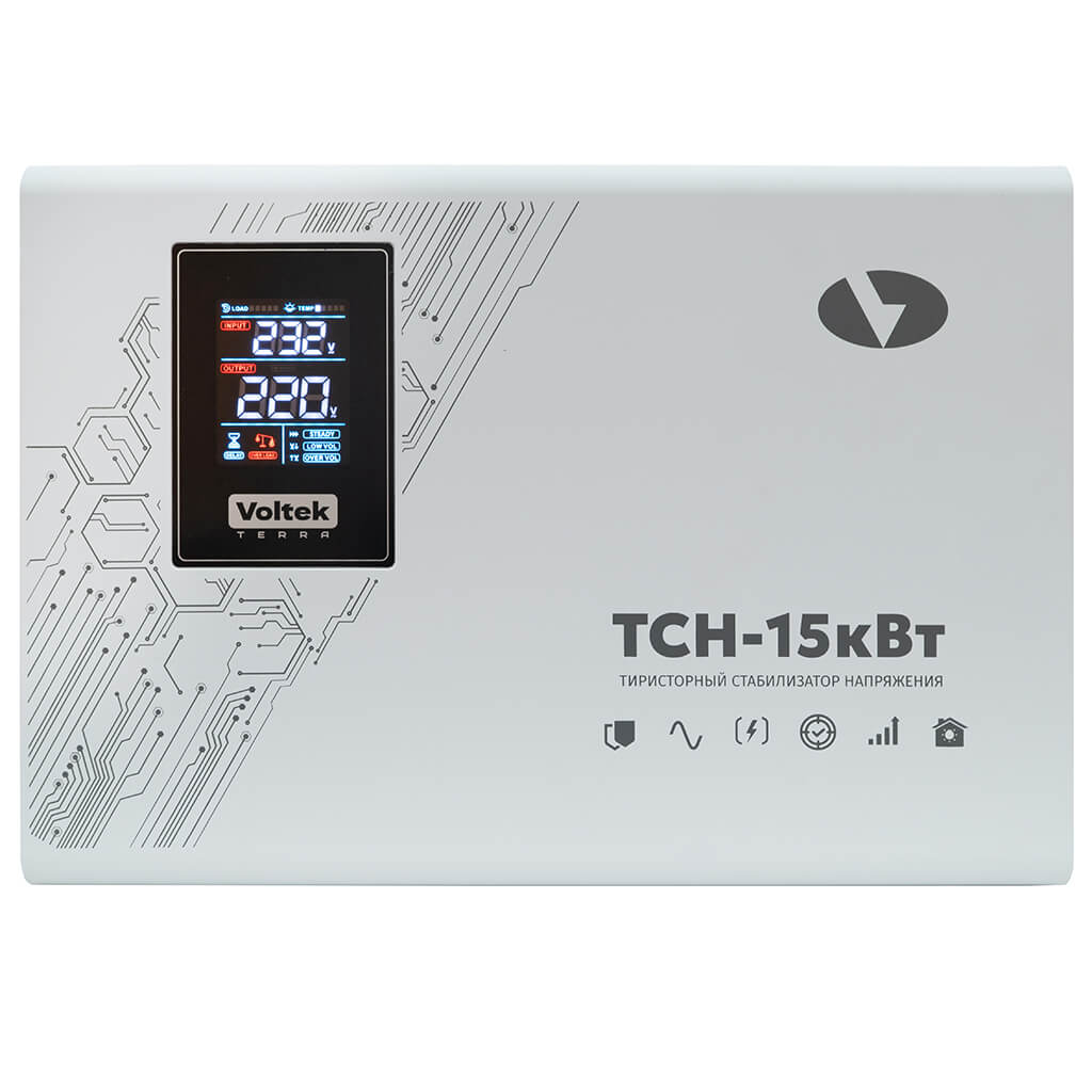 Стабилизатор Voltek ТСН-15кВт оснащен комплексом систем, обеспечивающим надежную защиту как потребителей, так и самого стабилизатора от любых нештатных ситуаций, и рассчитан на непрерывную круглосуточную работу в условиях больших по значению и длительности отклонений напряжения от номинального значения.